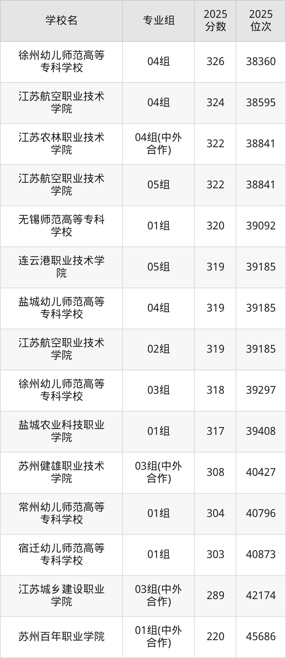2025年江苏历史组招生的公办大专院校专业组共计175个,其中录取分数线最低的为苏州百年职业学院,2025年最低分是220分,对应的是01组(中外合作),位次排名是45686名。收分最高的是江苏司法警官职业学院,2025年02组最低分是555分,位次排名是101名。
