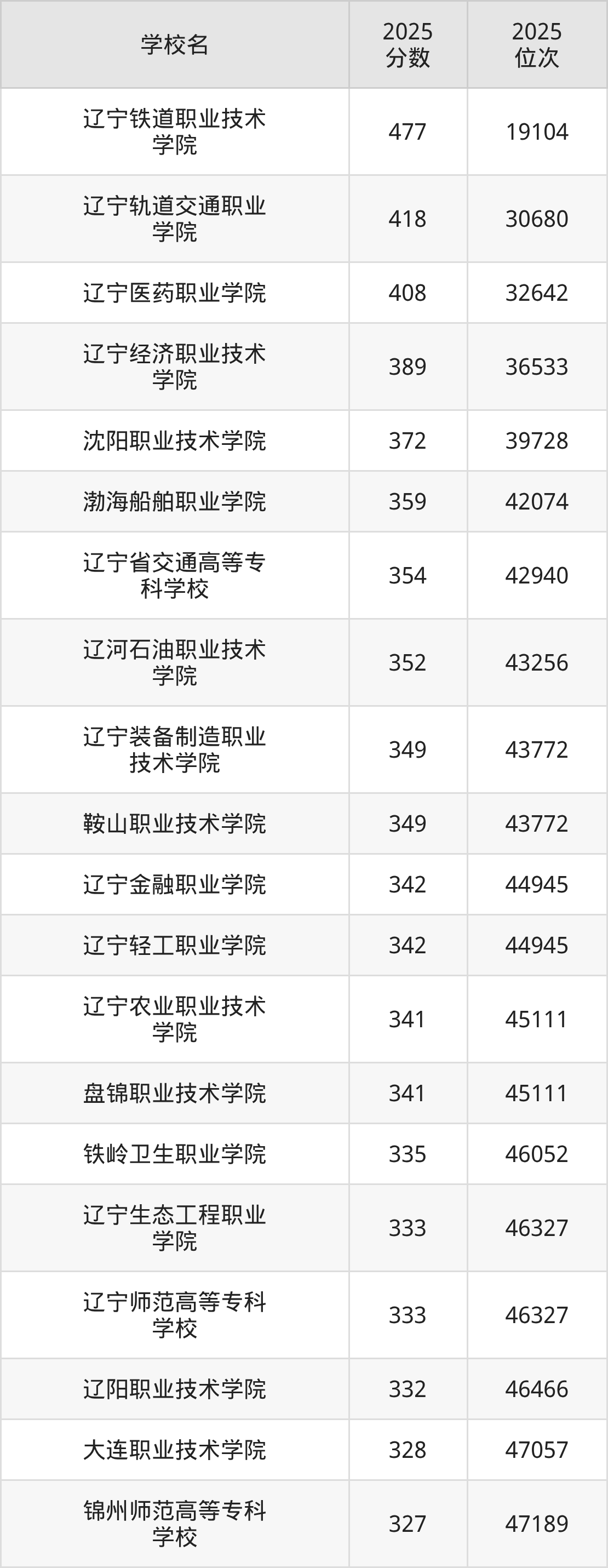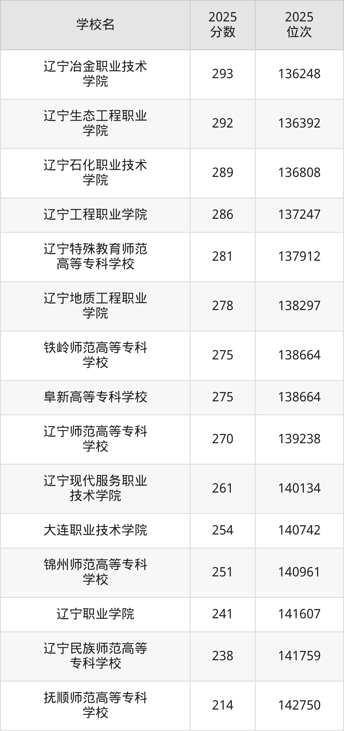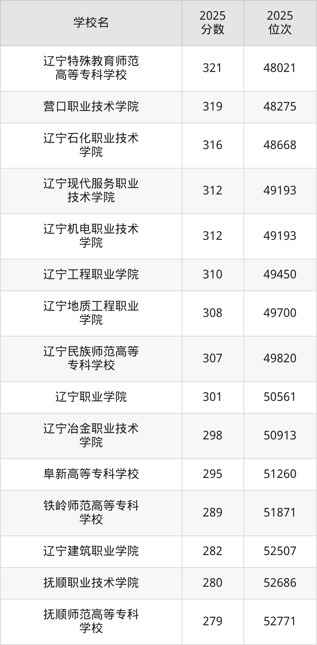 2025年辽宁历史组招生的公办大专院校共计35个,其中录取分数线最低的为抚顺师范高等专科学校,2025年最低分是279分,位次排名是52771名。收分最高的是辽宁铁道职业技术学院,2025年最低分是477分,位次排名是19104名。