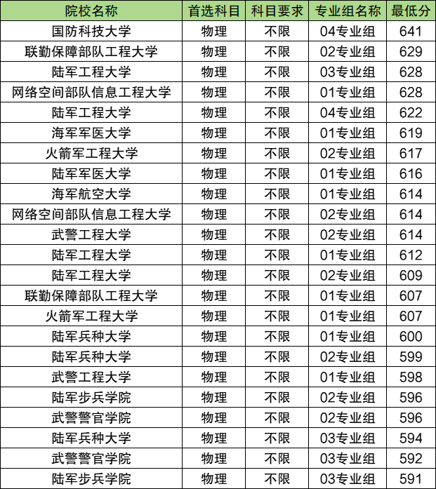 包括:国防科技大学、海军军医大学、陆军工程大学、陆军兵种大学、武警工程大学、网络空间部队信息工程大学等。其中,录取分数线最高的是国防科技大学04专业组,2025年最低分641分;录取分数线最低的是陆军步兵学院03专业组,最低分为591分。这些军校再选科目要求均为不限。