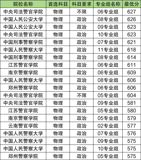 包括中国人民公安大学、江苏警官学院、郑州警察学院、云南警官学院等。物生政可报考的警校中,录取分数线最低的是郑州警察学院05专业组、中国人民警察大学10专业组和09专业组,2025年最低分575分,再选科目要求均为政治。录取分数线最高的是中央司法警官学院06专业组,2025年最低分为627分,再选科目要求为不限。