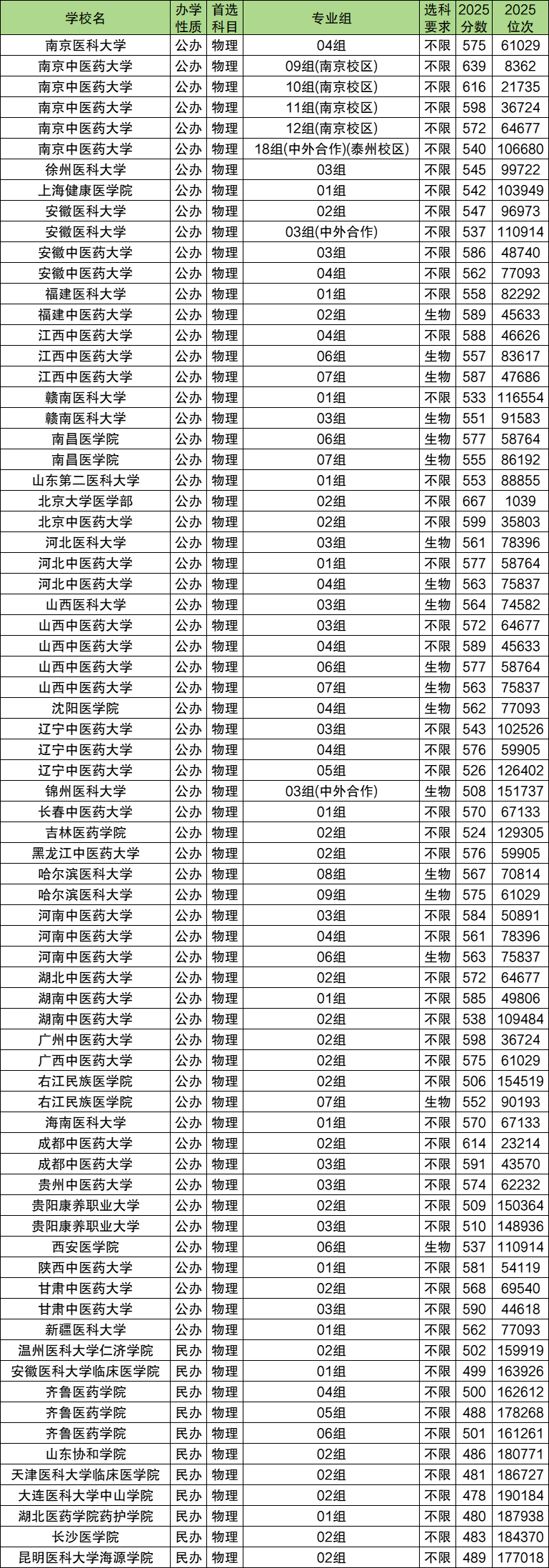 包括:安徽医科大学、上海健康医学院、福建中医药大学、河北医科大学等。物生政可选的医药类院校专业组中,录取分数线最低是478分,对应大连医科大学中山学院02组;录取分数线最高的是北京大学医学部02组,2025最低667分。