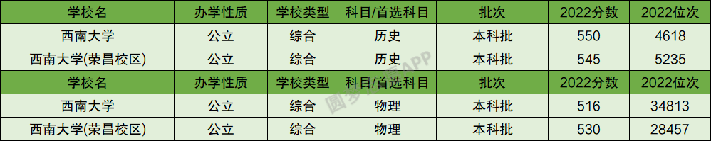 根据上图可知,西南大学2022年在重庆市历史类的投档分数线为550分,物理类的投档分数线为516分;西南大学(荣昌校区)在重庆历史类的投档分数线为545分,物理类的投档分数线为530分。