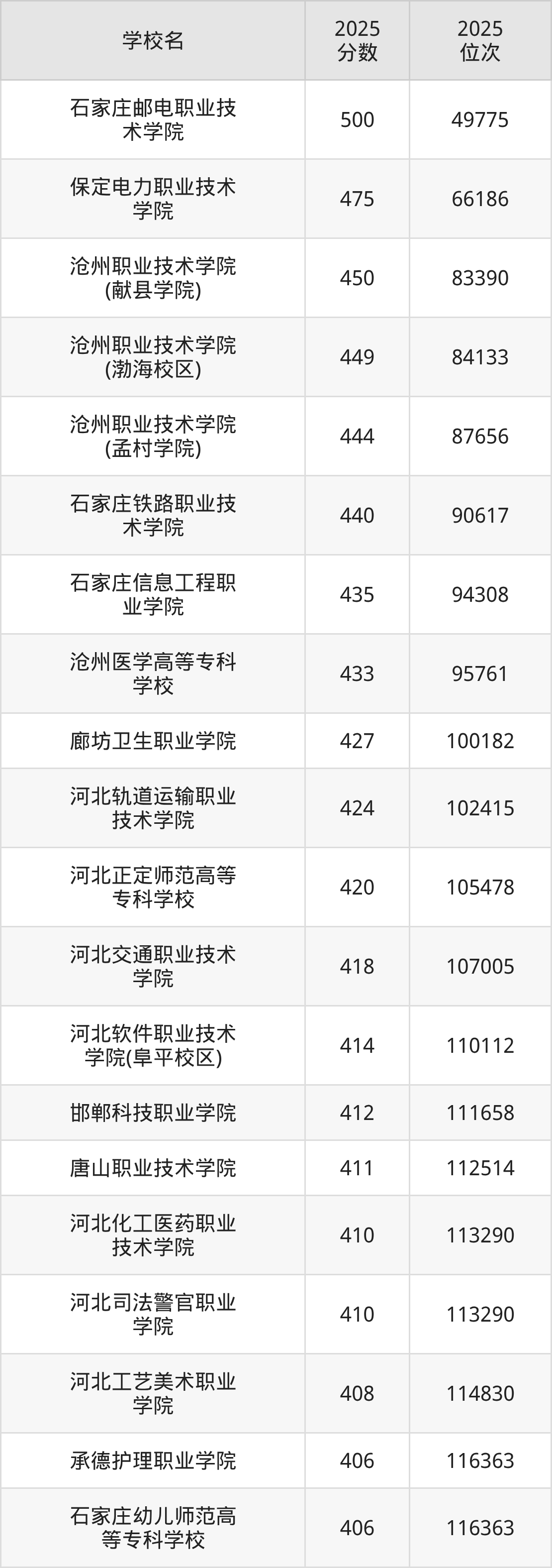 河北最好的公办大专院校是河北交通职业技术学院,排在全国第43名。2025年河北所有公办大专院校录取分数线:历史类259分到500分、物理类207分到481分。本文将整理河北公办大专院校名单大全,并附上各大学最低分数线汇总,供2026届高考生查阅。