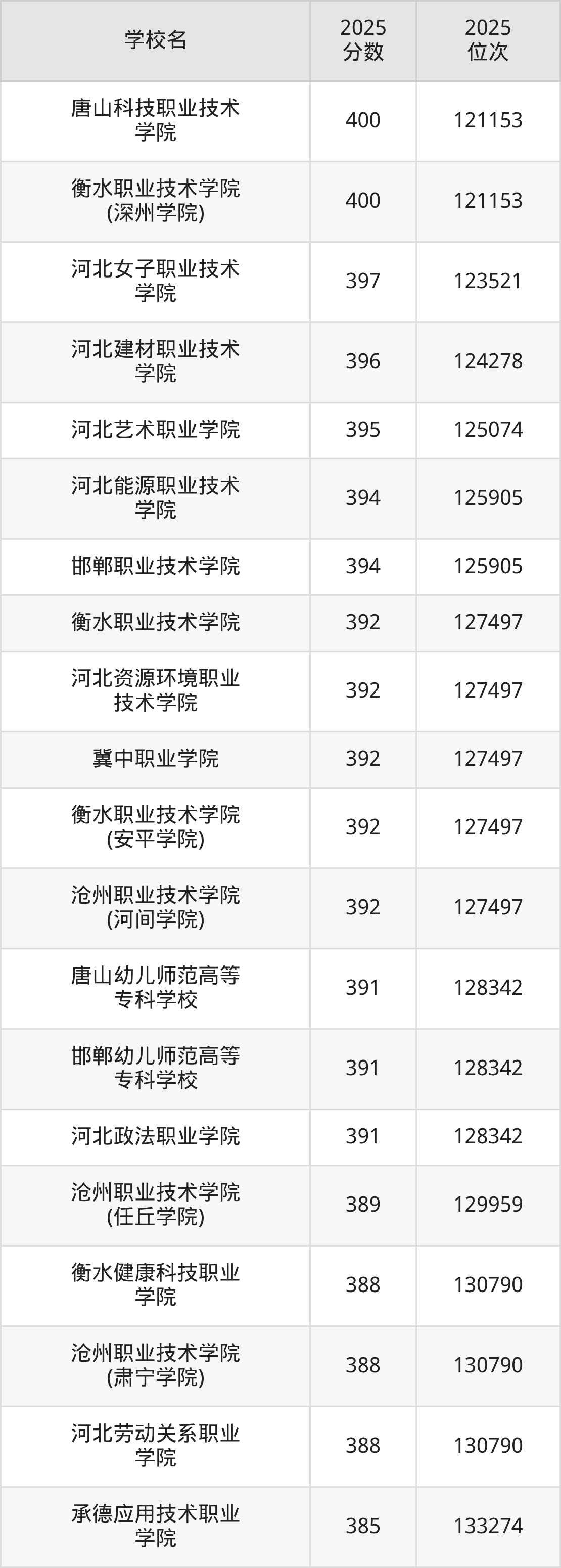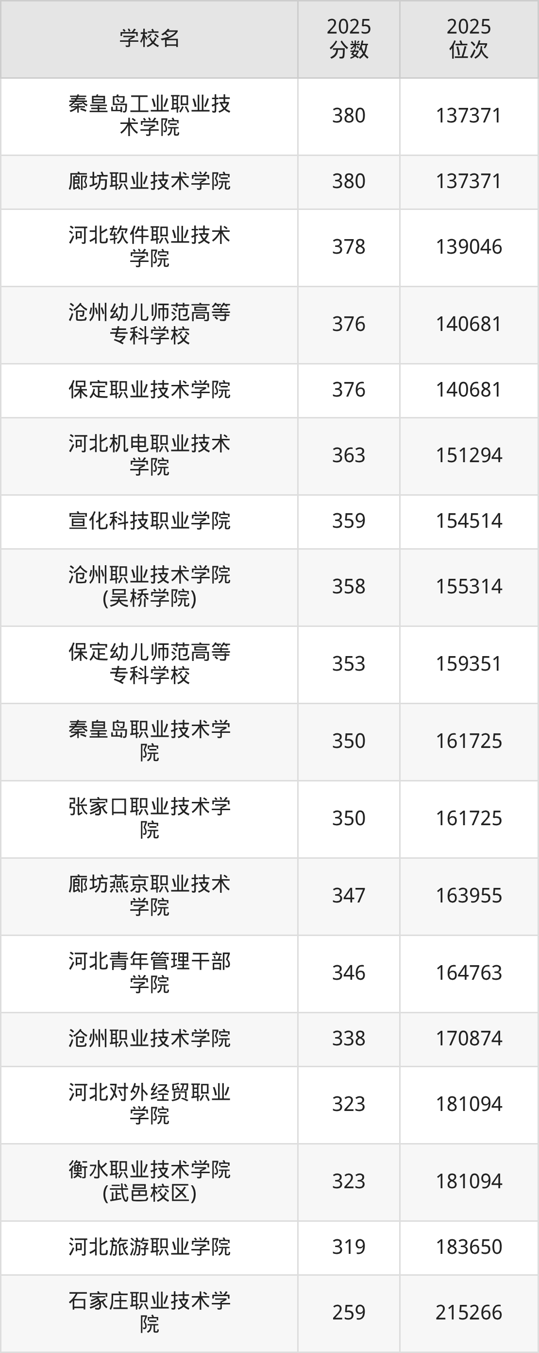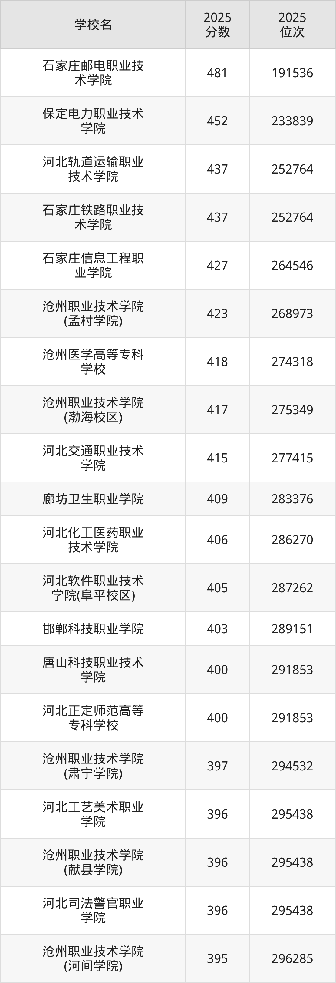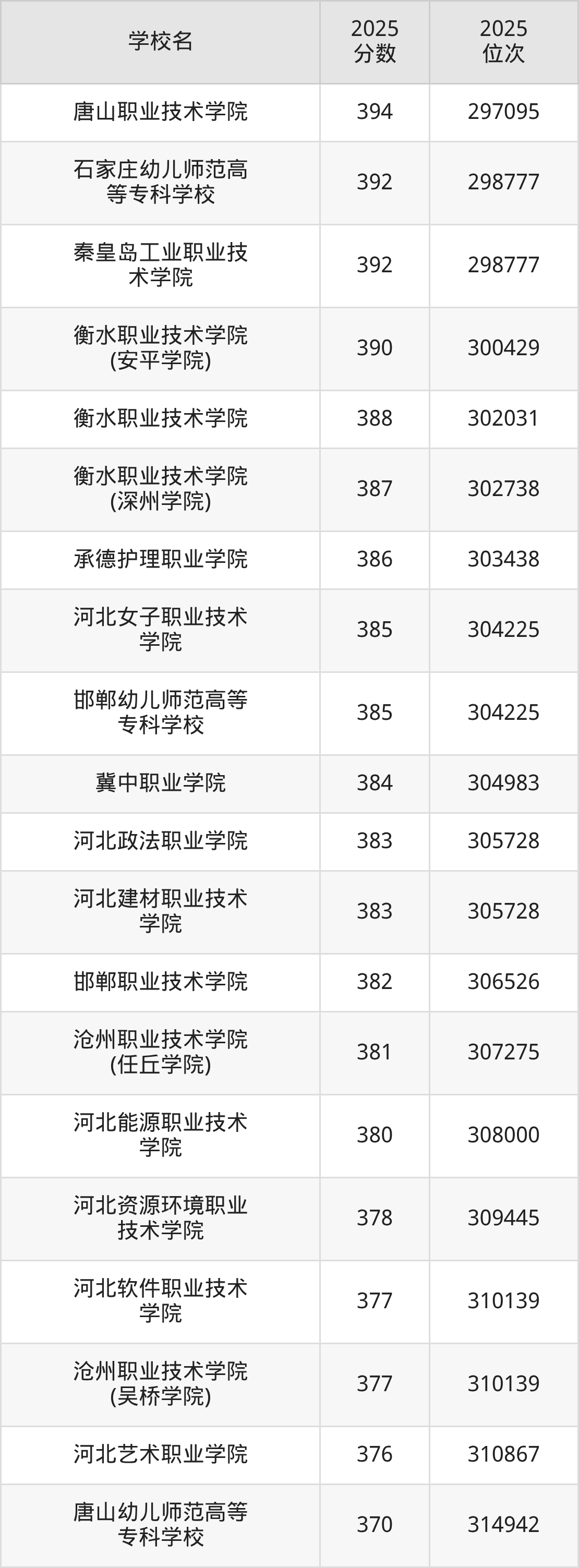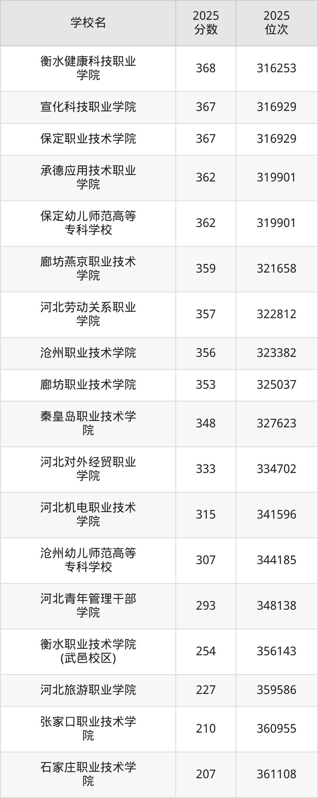 2025年河北历史组招生的公办大专院校共计47个,其中录取分数线最低的为石家庄职业技术学院,2025年最低分是259分,位次排名是215266名。收分最高的是石家庄邮电职业技术学院,2025年最低分是500分,位次排名是49775名。