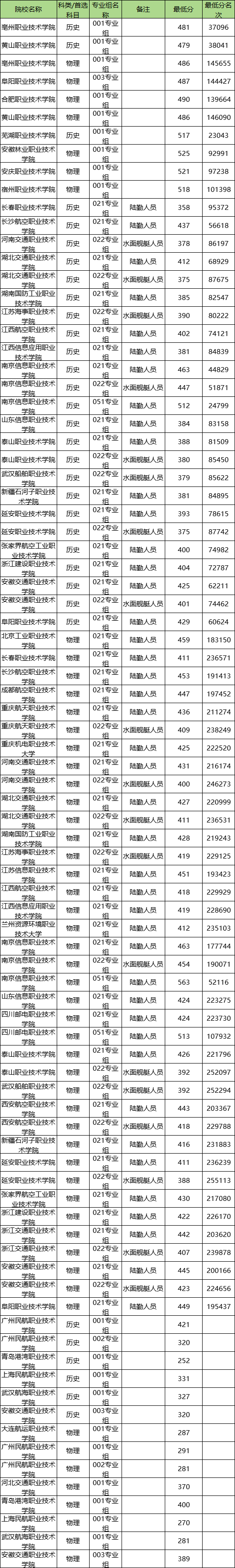 在历史类方面,报考难度最大的是芜湖职业技术学院(001专业组),录取线是517分。最好考的学校是青岛港湾职业技术学院(001专业组),分数是252分。