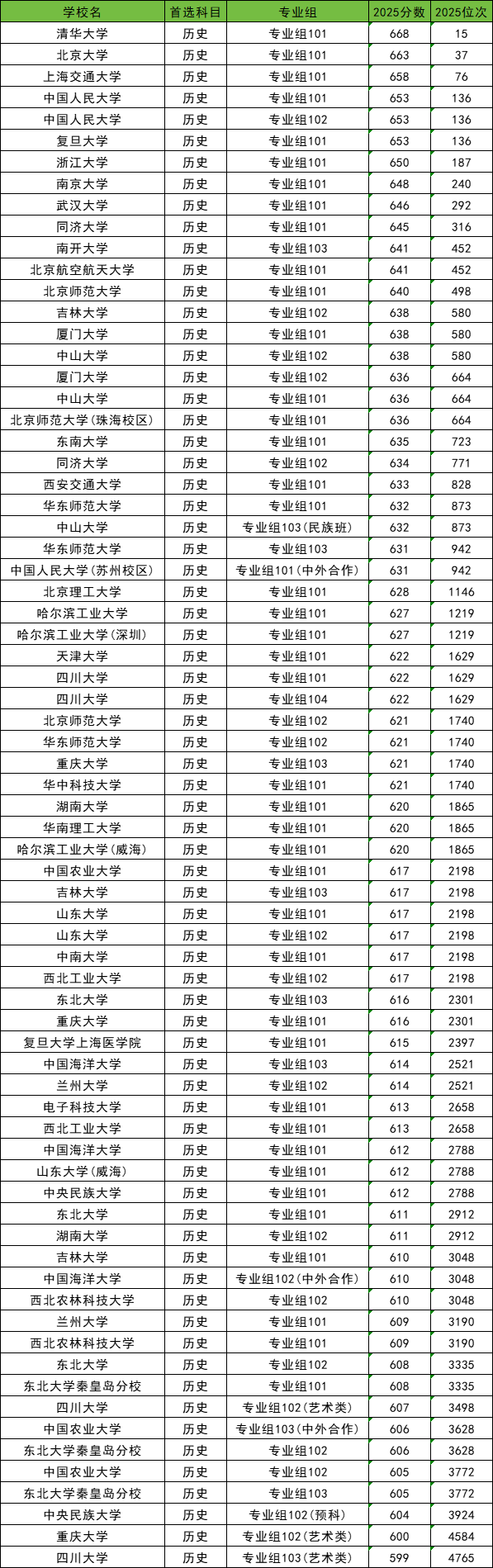 下面是985大学中历史类录取分数线最高的10所大学分数及位次详情: