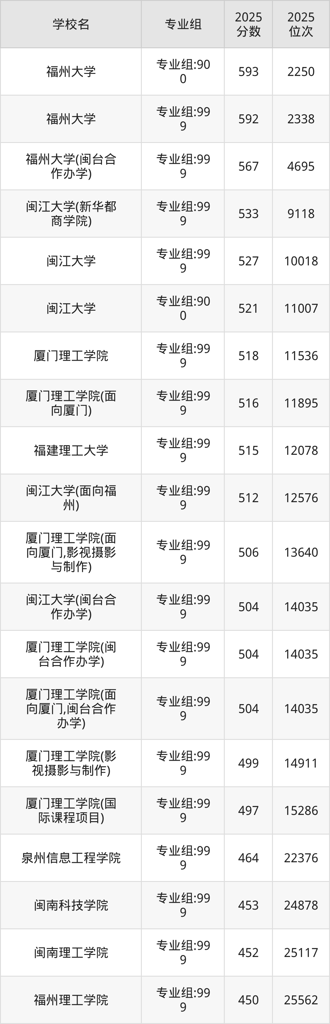 2025年福建历史组招生的理工类大学专业组共计22个,其中录取分数线最低的为福州理工学院、泉州职业技术大学等,2025年最低分是450分,对应的是专业组:999,位次排名是25562名。收分最高的是福州大学,2025年专业组:900最低分是593分,位次排名是2250名。