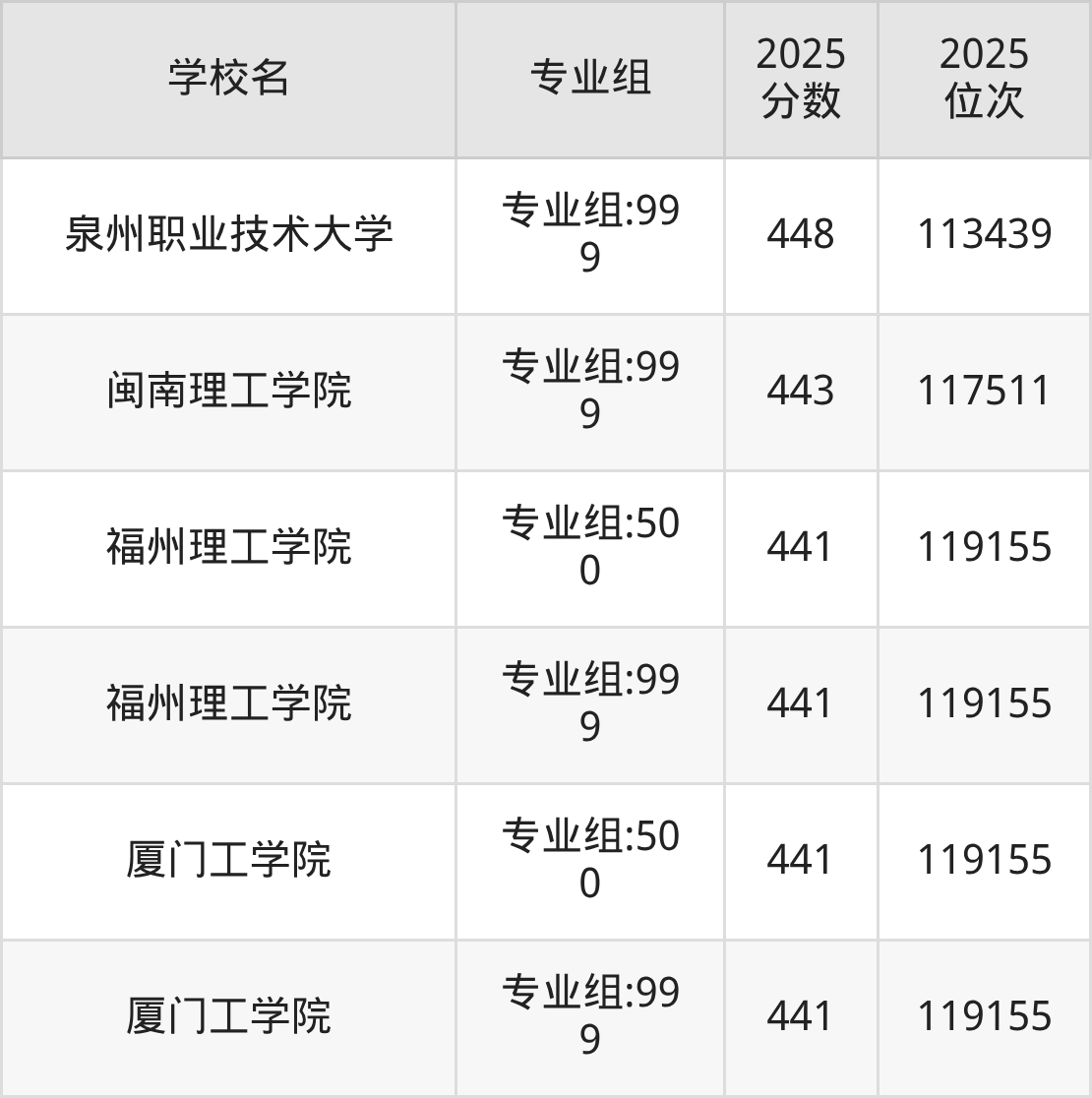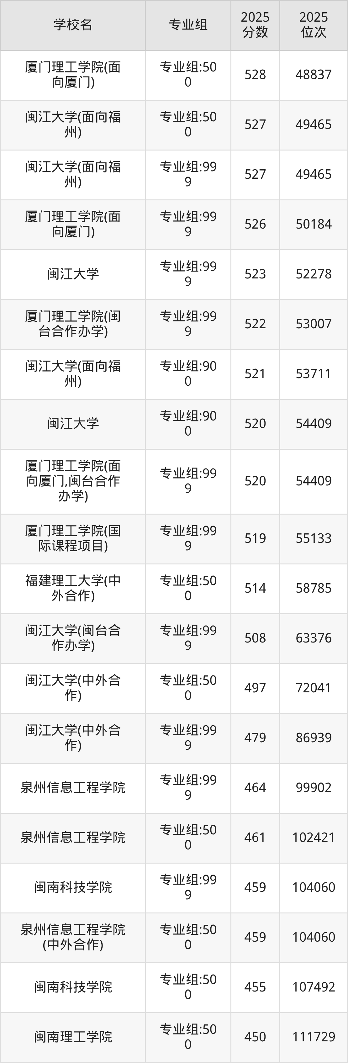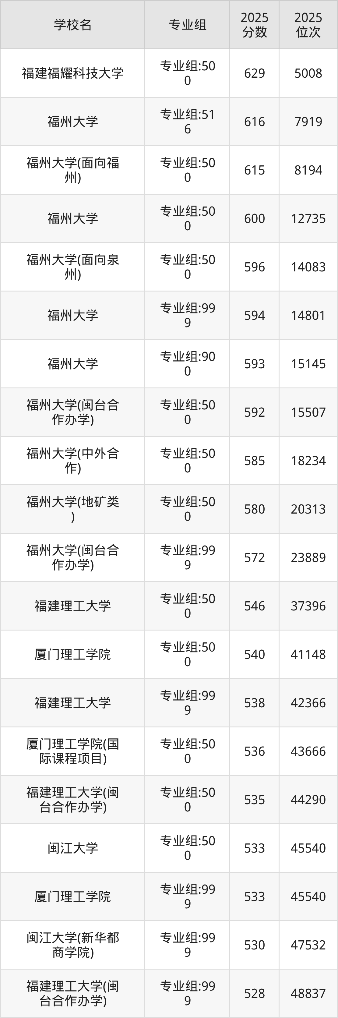 2025年福建物理组招生的理工类大学专业组共计46个,其中录取分数线最低的为福州理工学院、厦门工学院,2025年最低分是441分,对应的是专业组:500、专业组:999,位次排名是119155名。收分最高的是福建福耀科技大学,2025年专业组:500最低分是629分,位次排名是5008名。