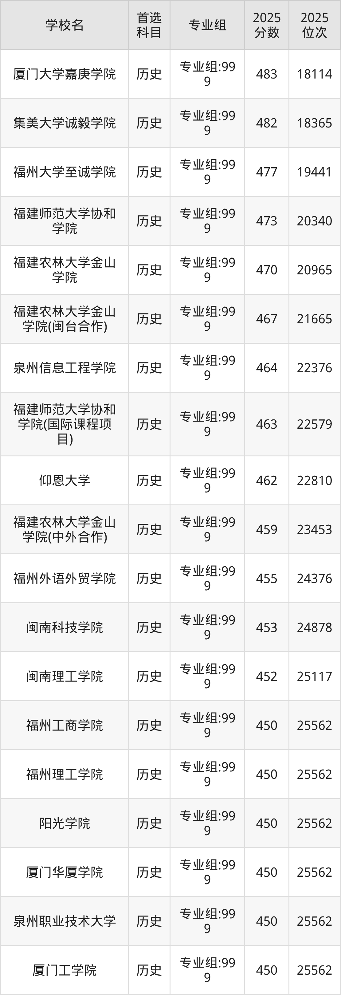 2025年福建民办本科大学中,历史组分数线最高、排名第一的院校是厦门大学嘉庚学院(专业组:999),录取分数是483分,录取位次18114位;
