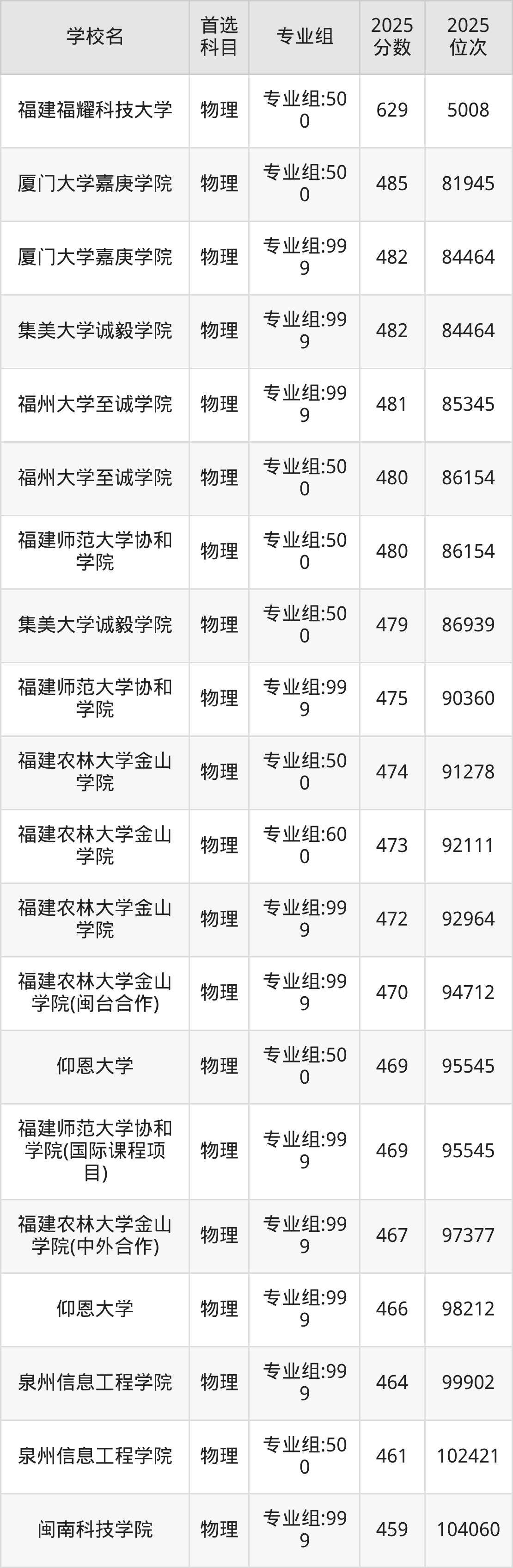 2025年福建民办本科大学录取分数线排名(物理方向):