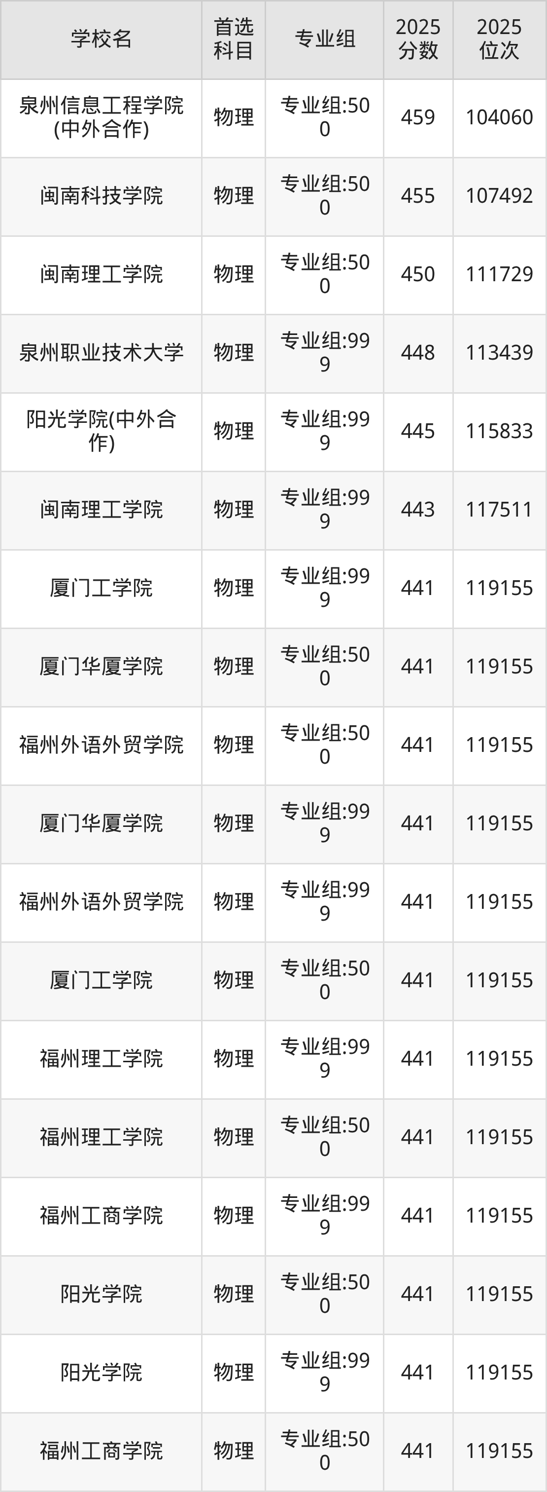 2025年福建民办本科大学中,物理组分数线最低、排名最后的院校是厦门工学院(专业组:999)、厦门华厦学院(专业组:500)、福州外语外贸学院(专业组:500)等,录取分数是441分,录取位次119155位。