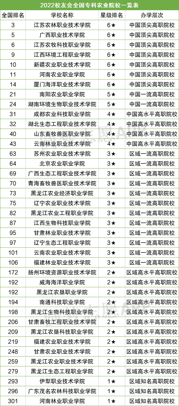 国的专科农业院校有39所,其中排名前五的是江苏农林职业技术学院(全国第3名)、广西职业技术学院(全国第5名)、江苏农牧科技职业学院(全国第6名)、江西环境工程职业学院(全国第9名)、新疆农业职业技术学院(全国第10名)