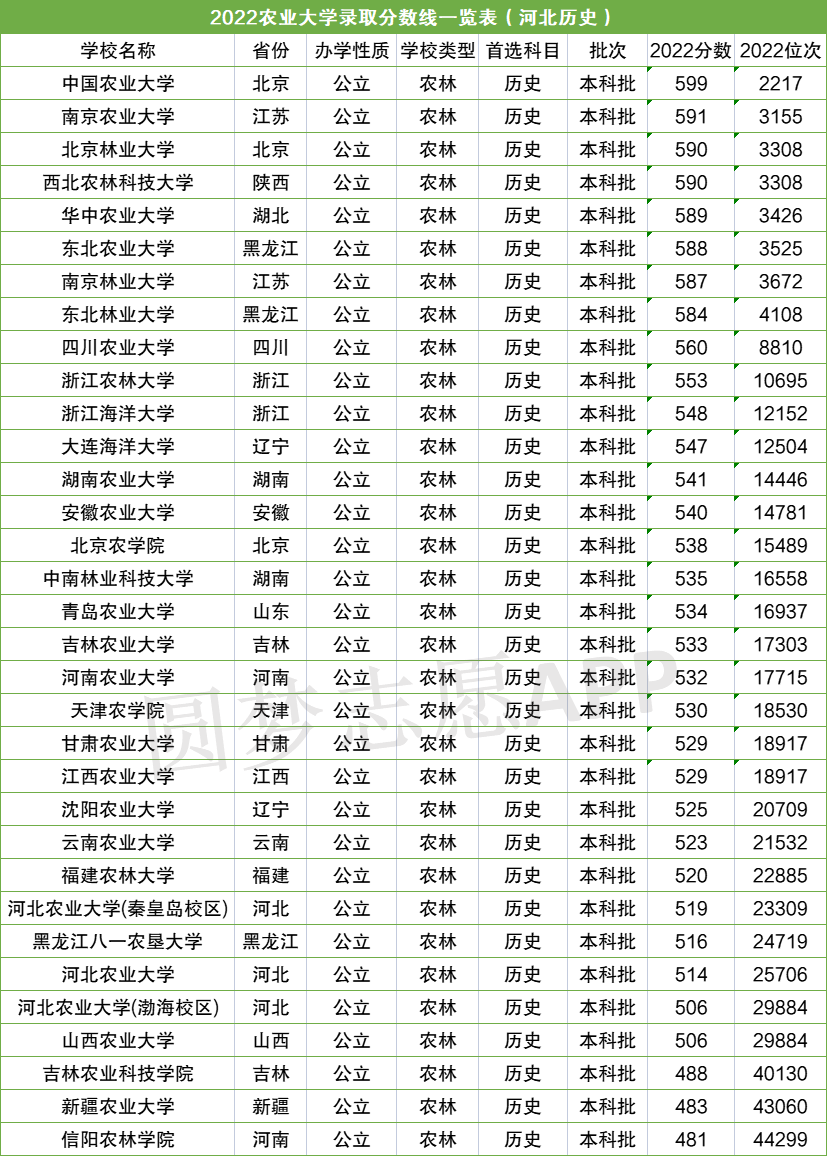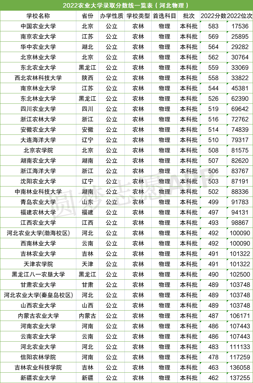 二.全国农业大学分数线最低一览表