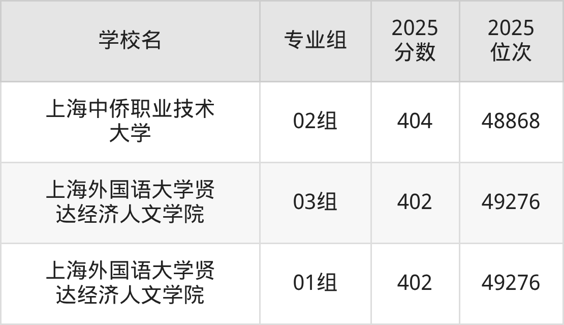 2025年上海民办二本大学中,分数线最低、排名最后的院校是上海外国语大学贤达经济人文学院(03组),录取分数是402分,录取位次49276位。