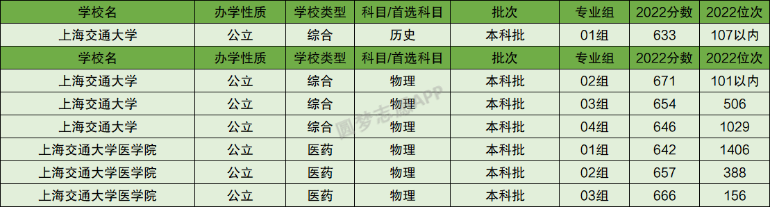 根据上图可知,上海交通大学2022年在江苏省历史类的投档分数线为633分,物理类的投档分数线为646分;上海交通大学医学院在江苏物理类的投档分数线为642分。