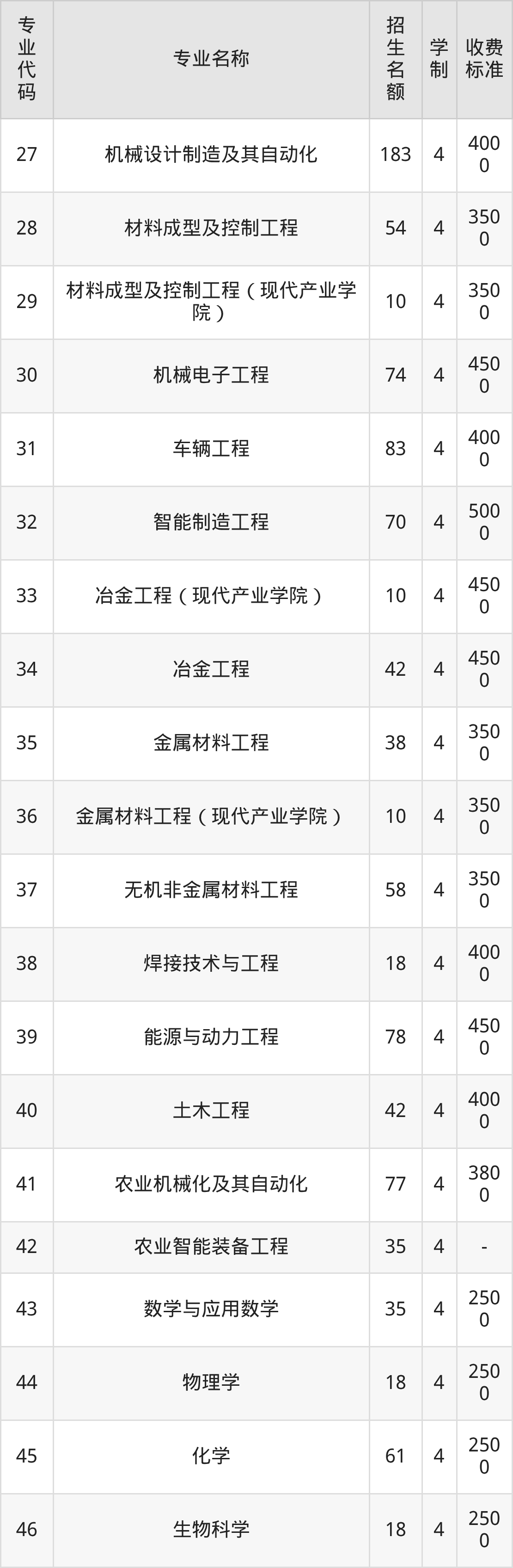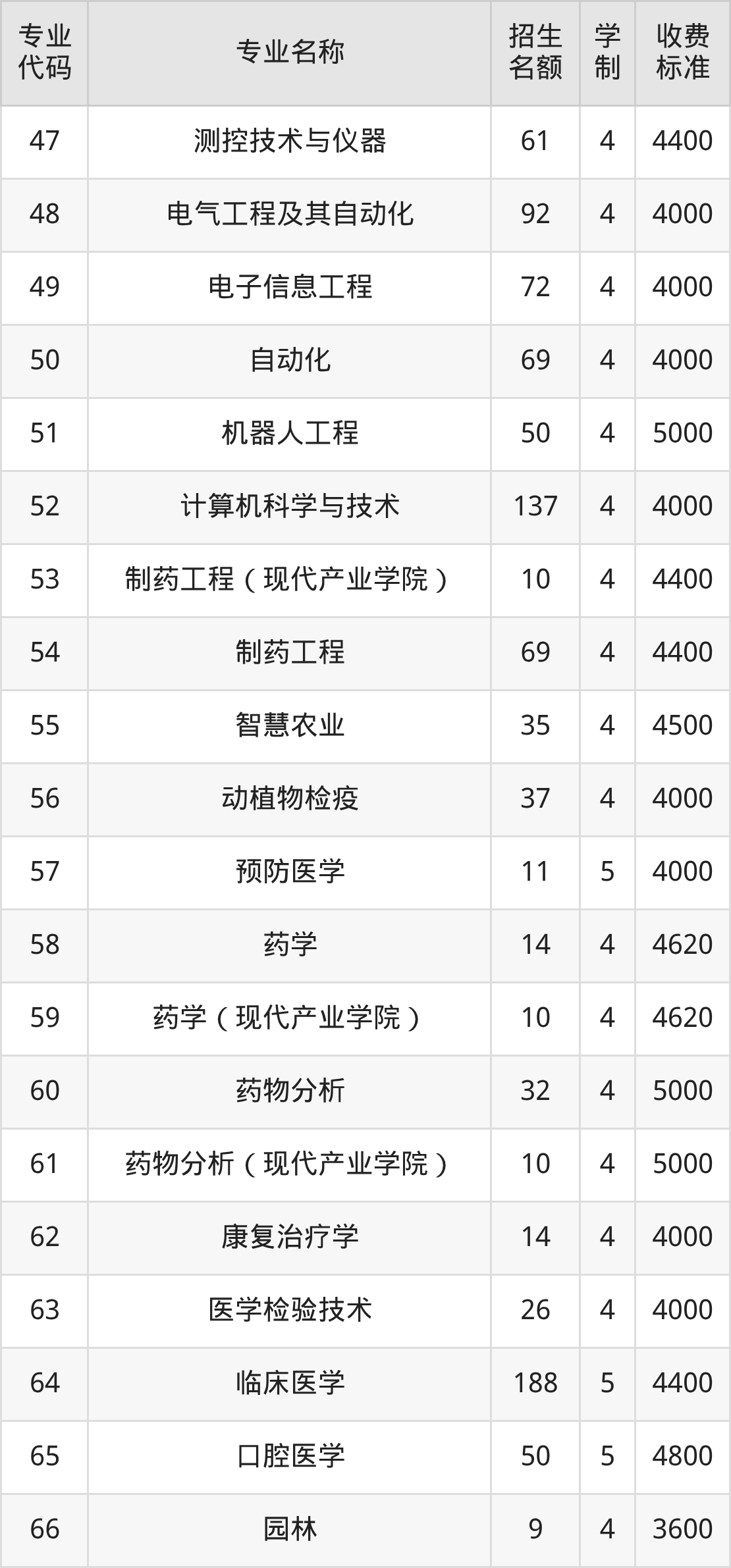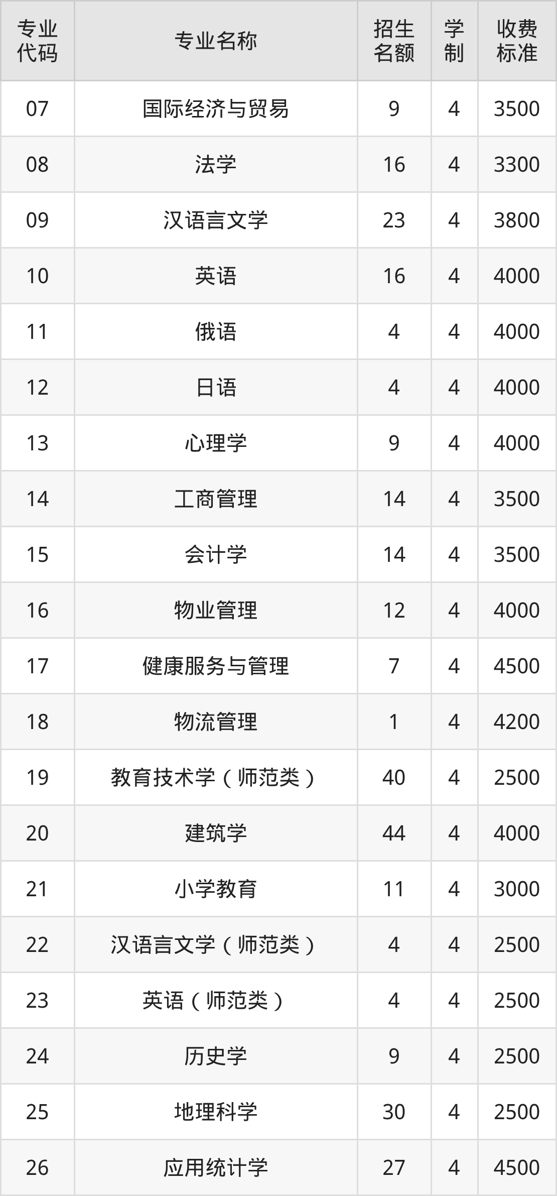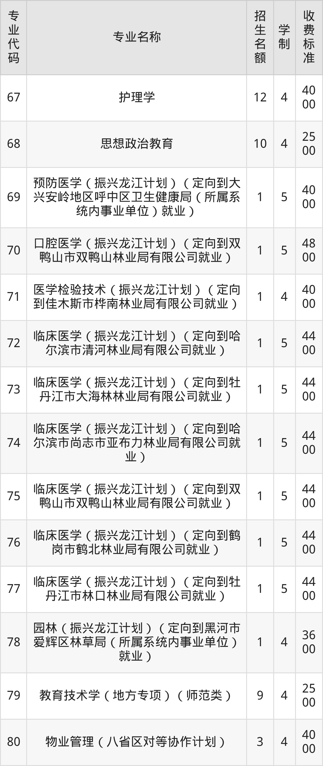 | 专业 代码 | 专业名称 | 招生 名额 | 学 制 | 收费 标准 |