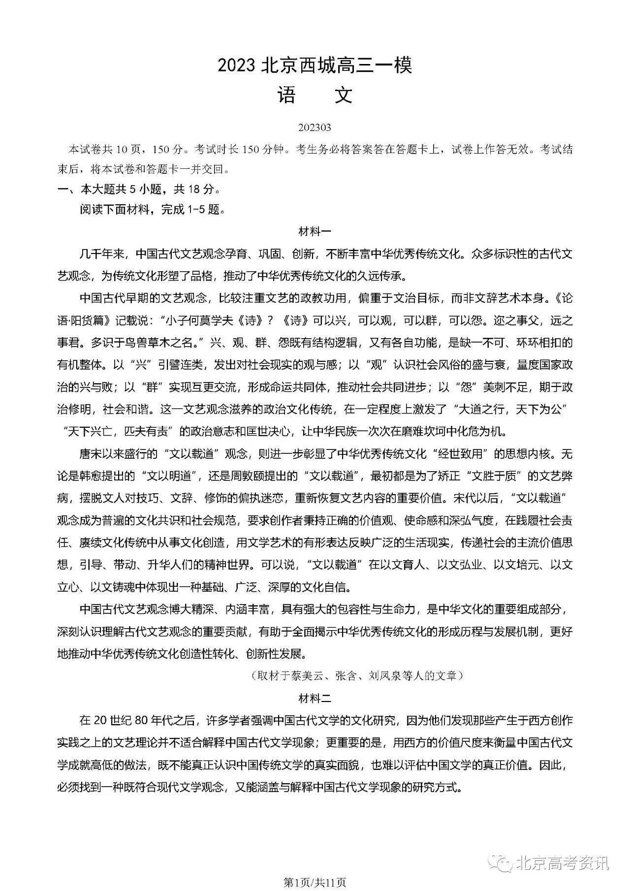 一、2023北京西城区高三一模语文答案及试题