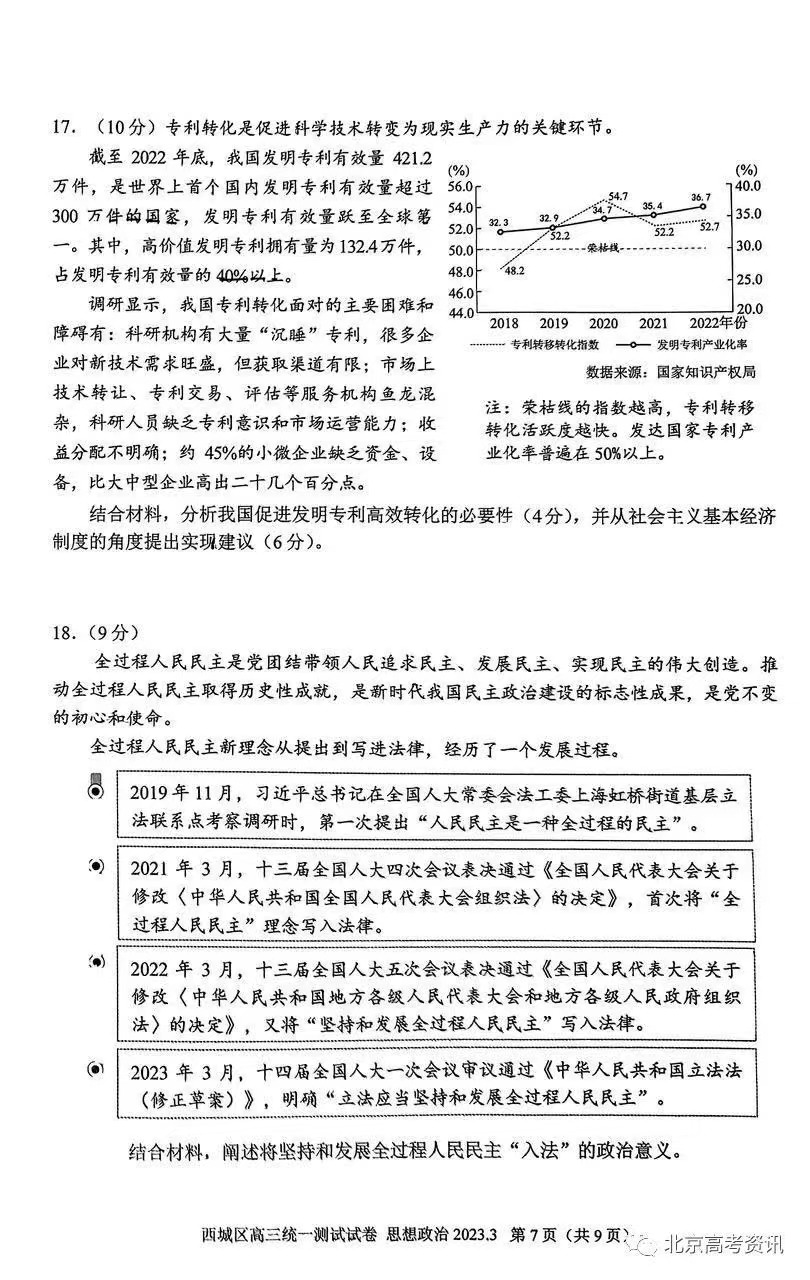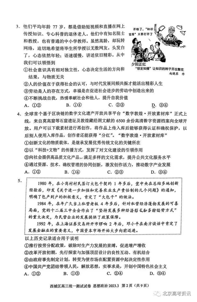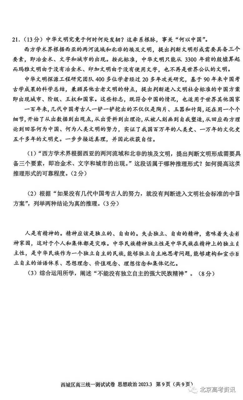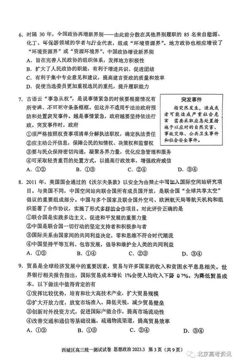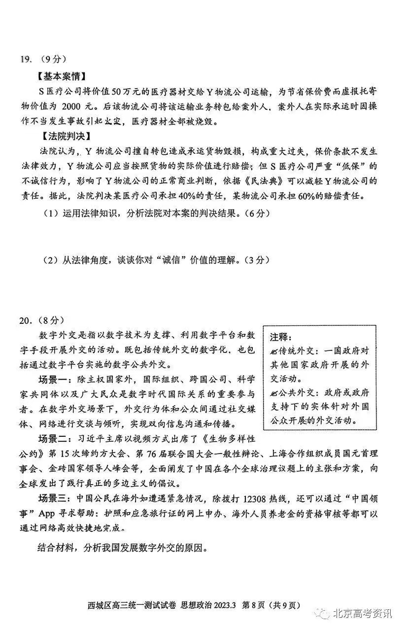 七、2023北京西城区高三一模政治答案及试题