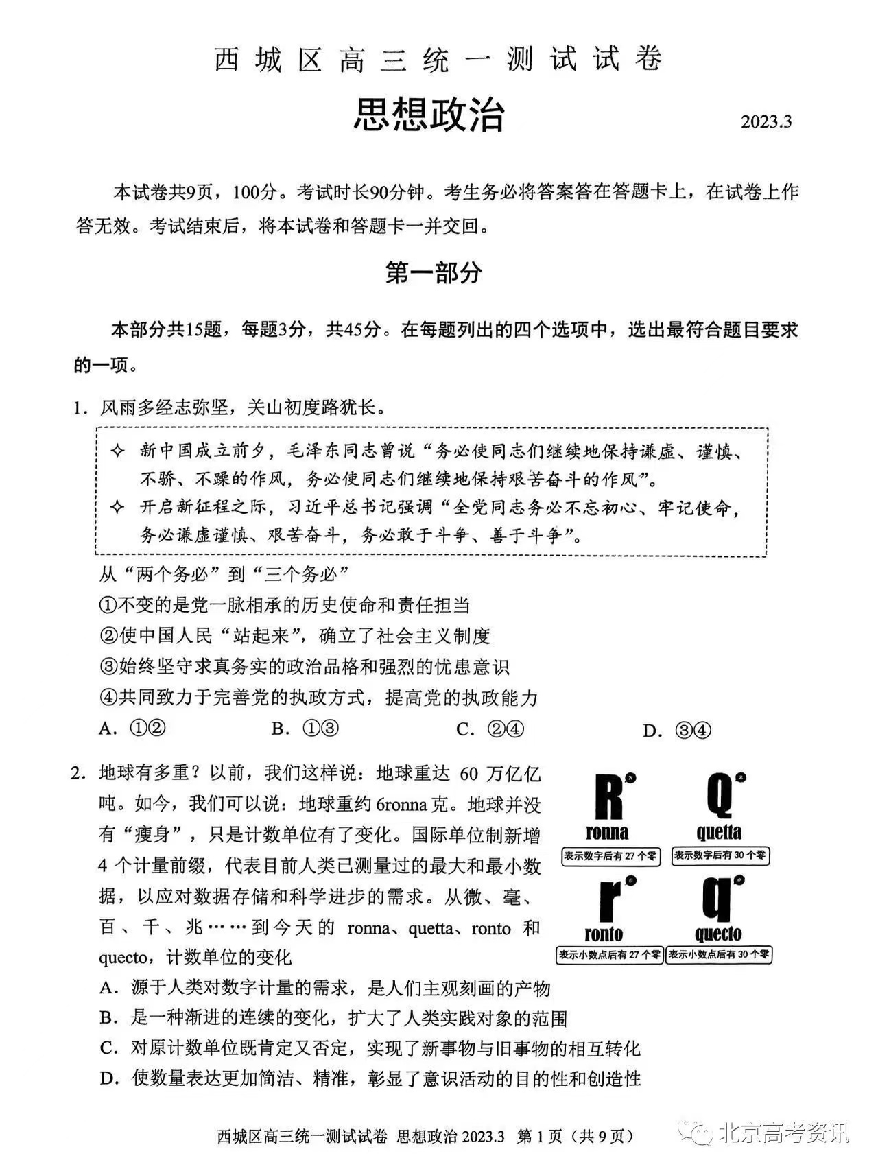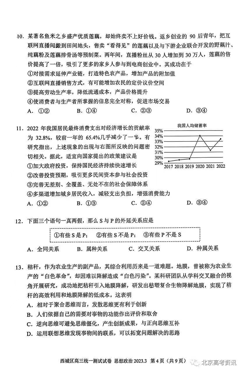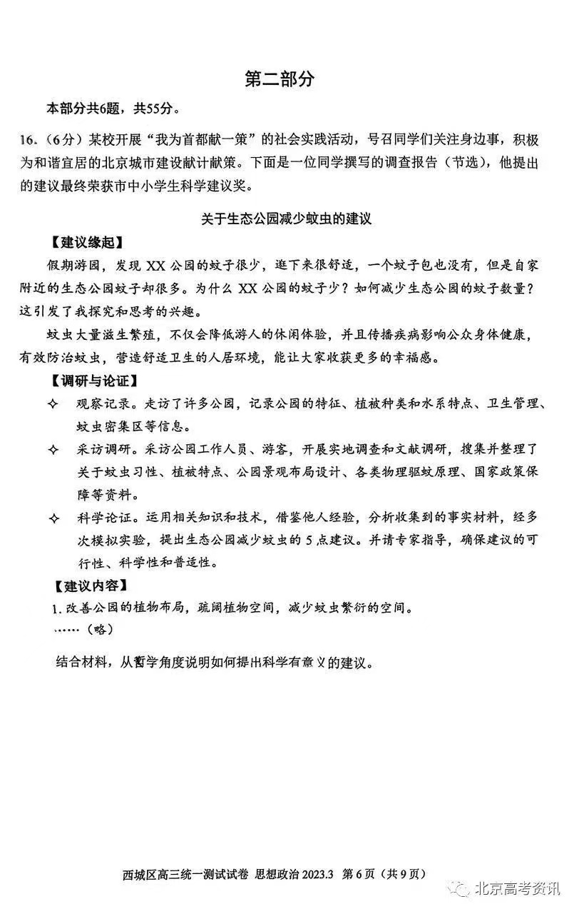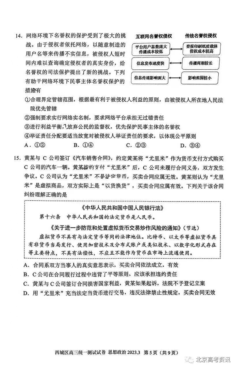七、2023北京西城区高三一模政治答案及试题