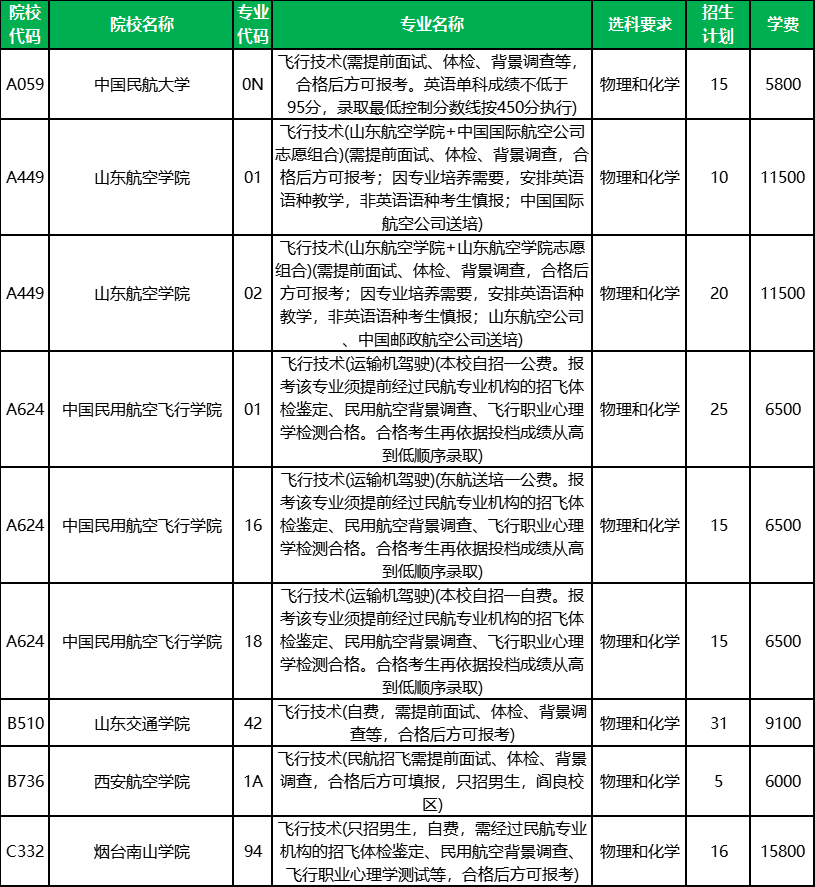 院校名单:中国民航大学、黑龙江八一农垦大学、山东航空学院、中国民用航空飞行学院、山东交通学院。