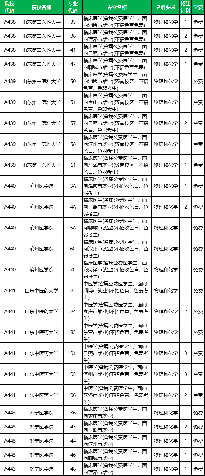院校名单:山东第二医科大学、山东第一医科大学、滨州医学院、山东中医药大学、济宁医学院。