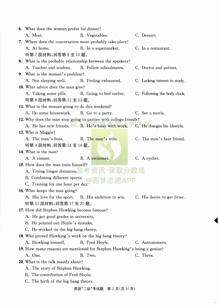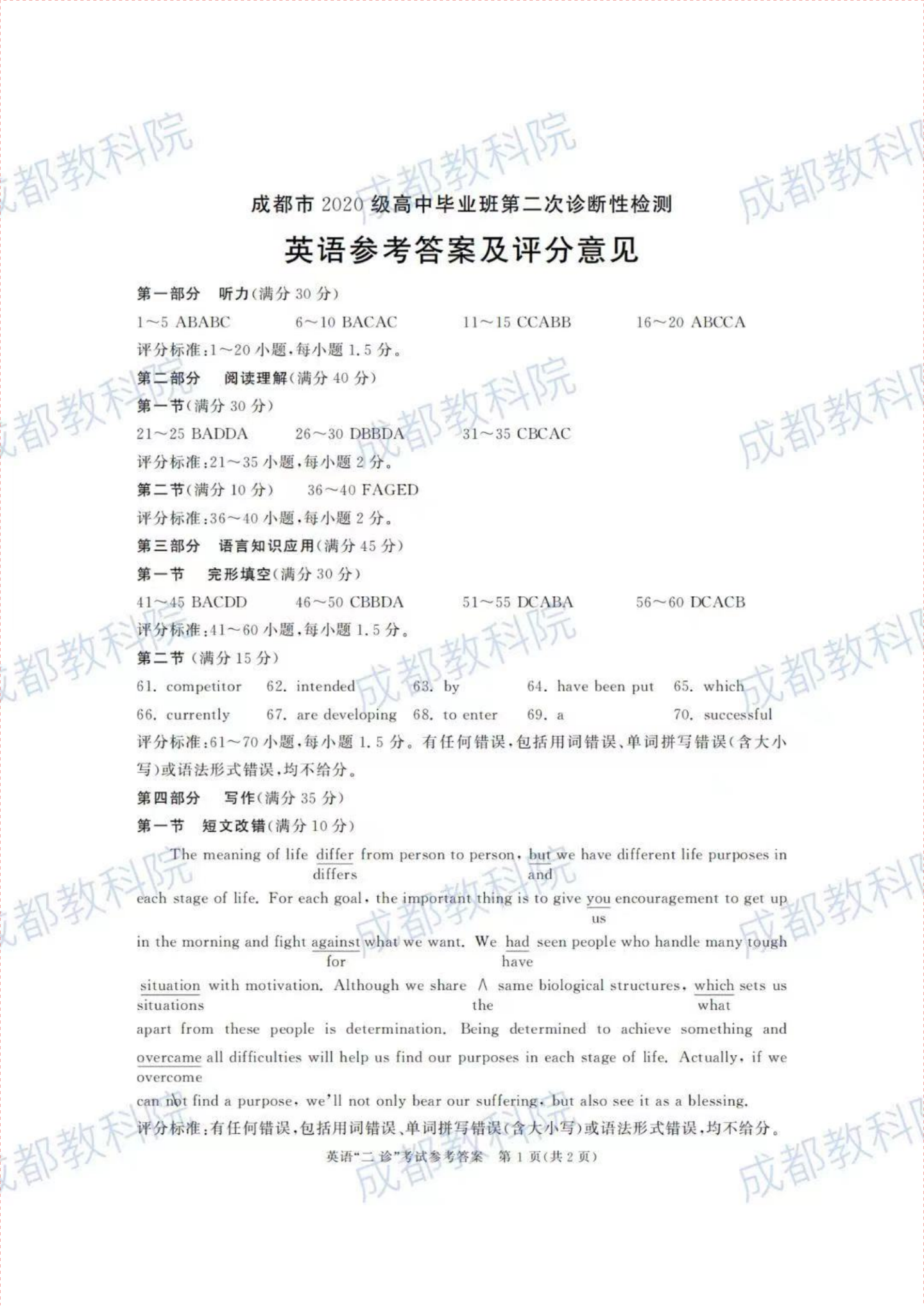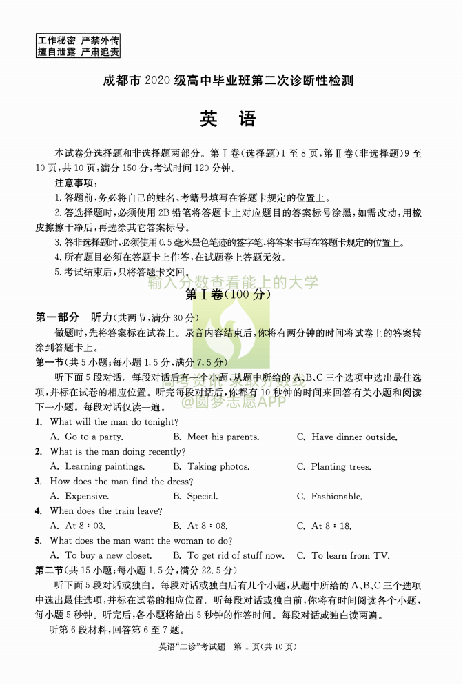 2023成都二诊考试将于2023年3月20日开考,考试结束后本文将更新成都市2023届高三第二次诊断性考试英语答案及试卷,下文为小编搜集整理的2023成都二诊英语试题及参考答案,供大家参考。