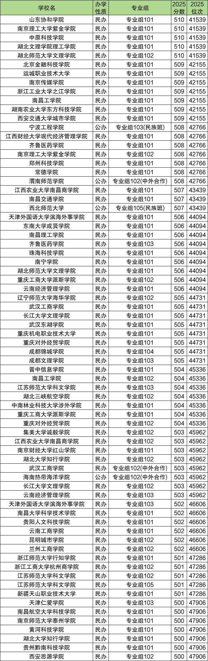 500分到510分数段位次最低的大学有黄河科技学院101组、贵州黔南科技学院101组等,最低分500分,位次是47906名;该分数段位次排名最高对应的是山东协和学院101组、湖北师范大学文理学院102组等,2025年最低分510分,位次是41539名。