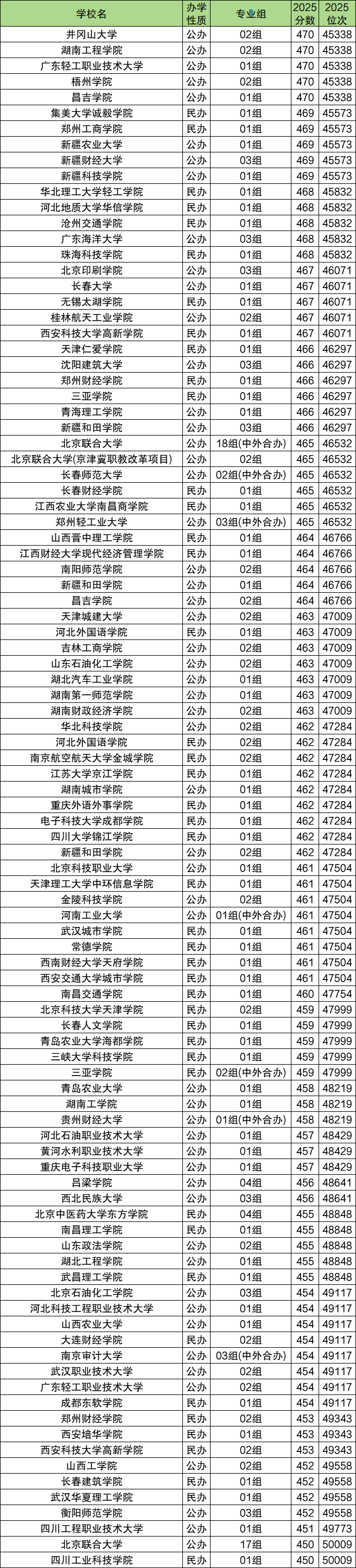 450分到470分数段位次最低的大学是四川工业科技学院01组和北京联合大学17组,最低分450分,位次是50009名;该分数段位次排名最高对应的是湖南工程学院02组、梧州学院02组、广东轻工职业技术大学01组等,2025年最低分470分,位次是45338名。