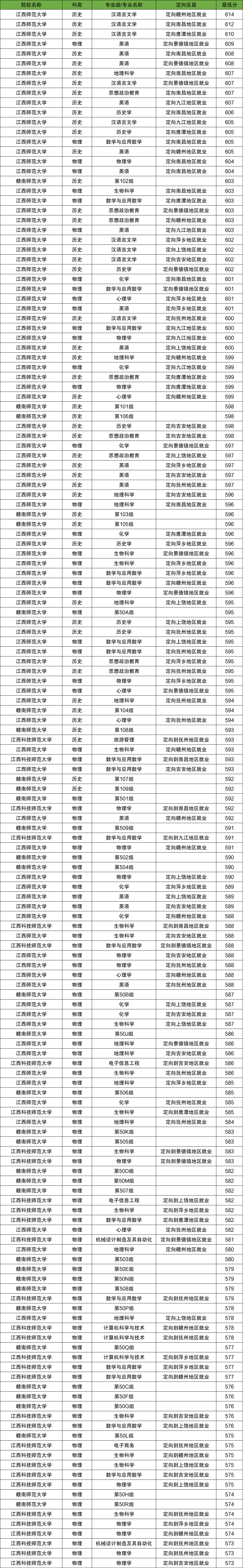 江西地方(省属)公费师范生的分数线比较复杂,同一院校同一专业面向不同的县(区)都有不同的分数,供大家参考。