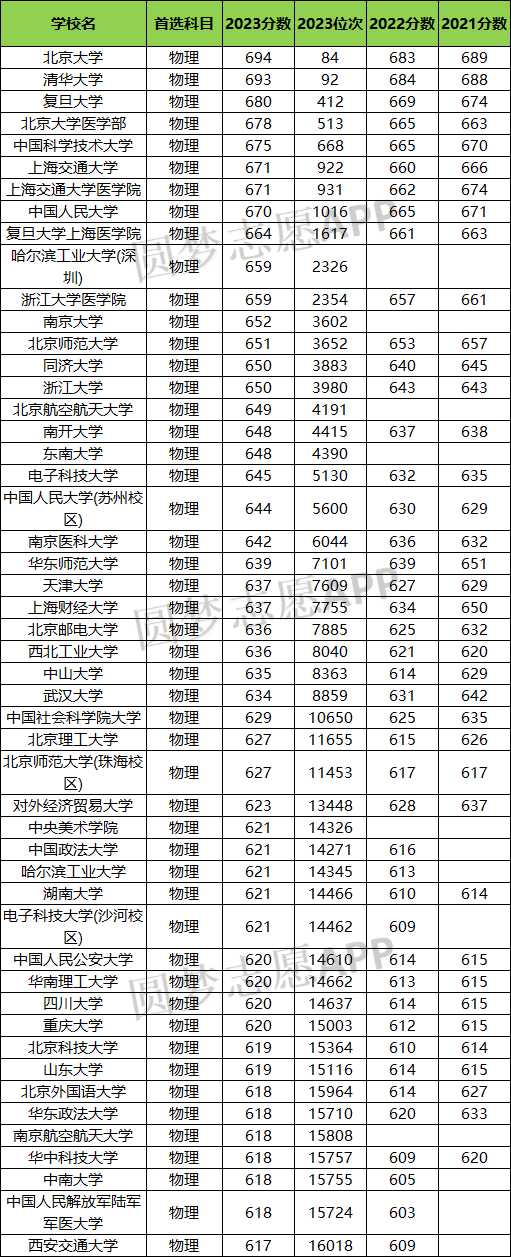 下面是其中50所大学名单,以及近三年物理类分数线。