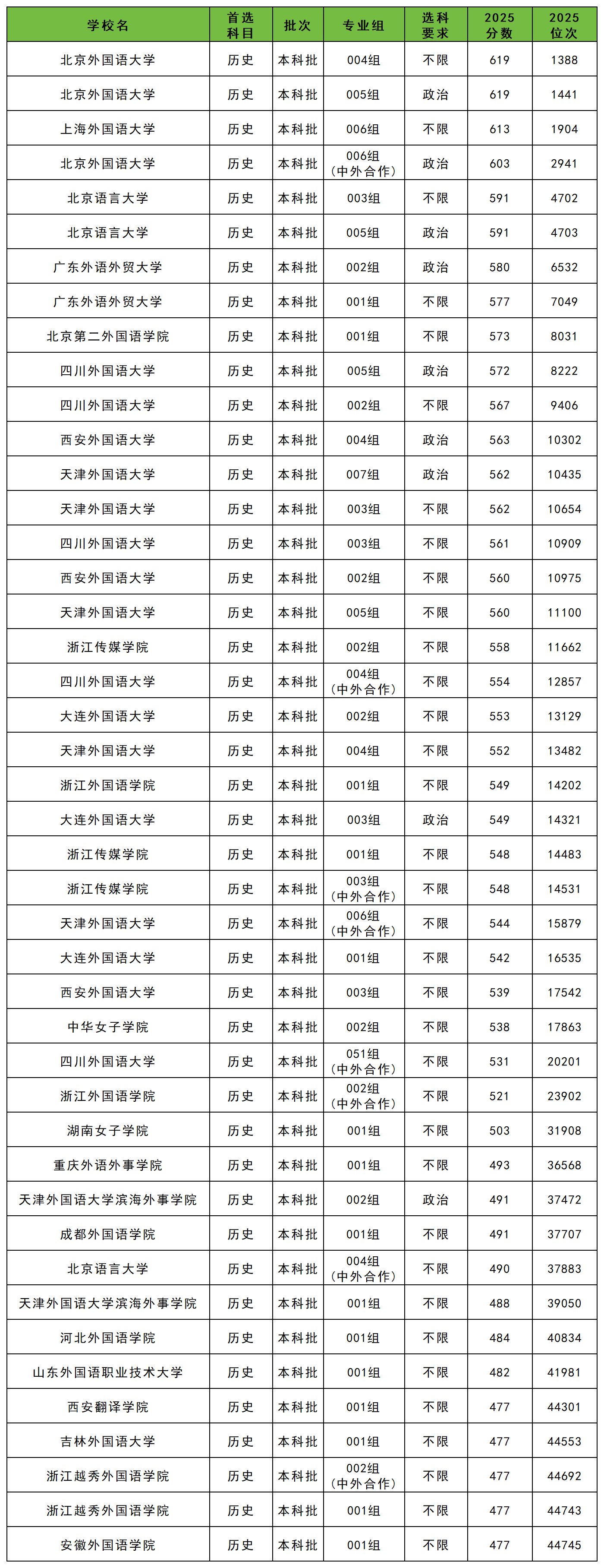 历史类外国语大学录取分数线一览表:
