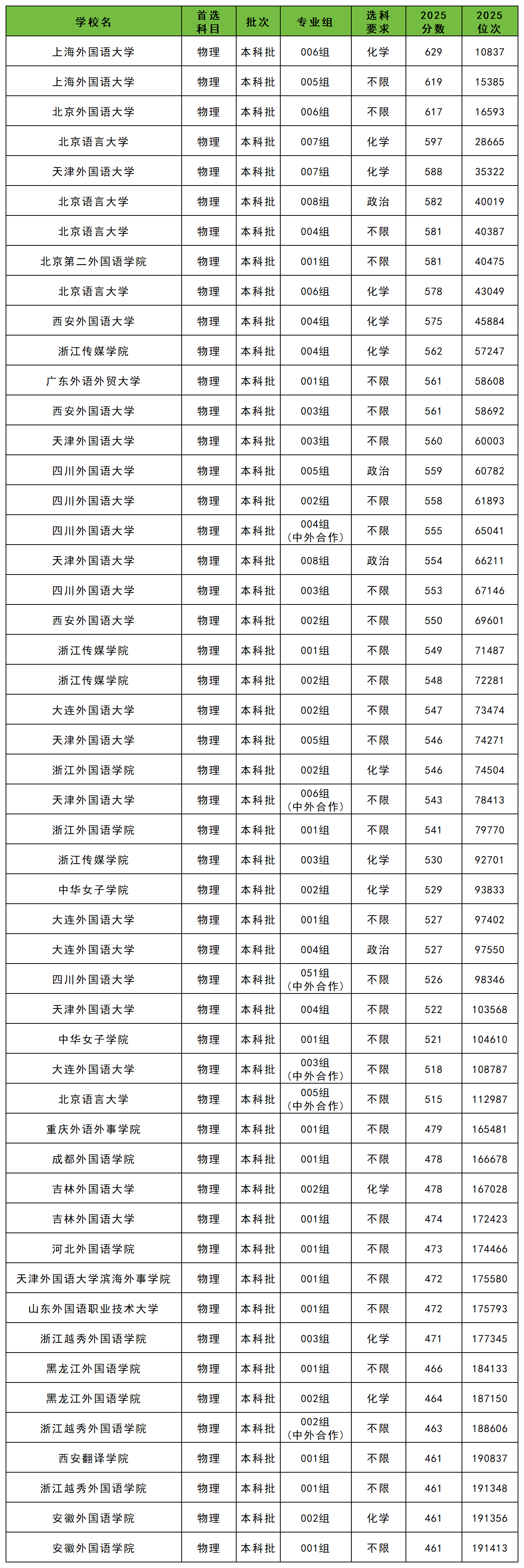 物理类考生最难考上的是上海外国语大学006组,2025年最低分629分;最好考上的有安徽外国语学院001组和002组、浙江越秀外国语学院001组、西安翻译学院001组,2025年最低分461分。