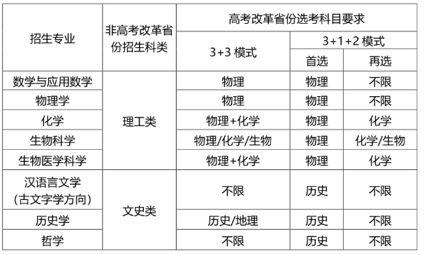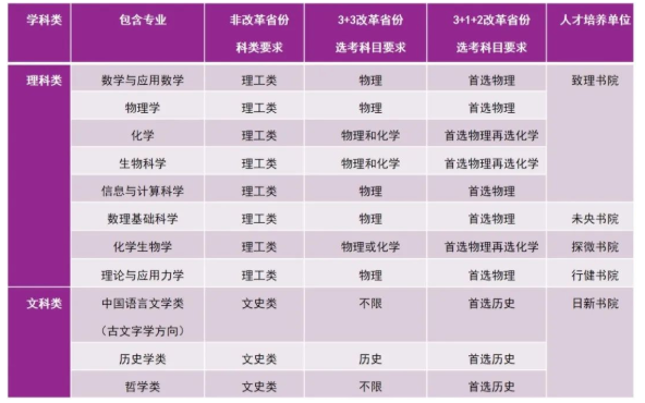 (1)基础理科学术类专业包括:数学与应用数学、物理学、化学、生物科学、信息与计算科学,旨在选拔并培养在基础理科领域有突出特长且有志于从事相关基础研究的学生。