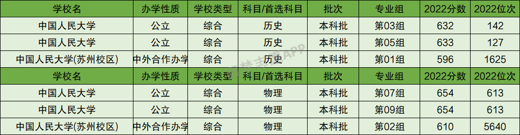 根据上图可知,中国人民大学2022年在湖北省历史类的投档分数线为632分,物理类的投档分数线为654分;中国人民大学(苏州校区)在湖北历史类的投档分数线为596分,物理类的投档分数线为610分。