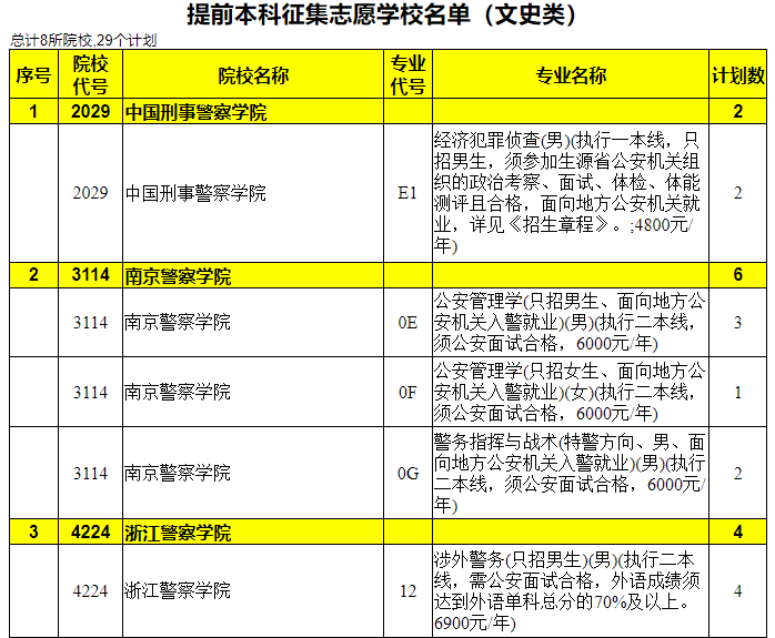 2024陕西本科提前批A段征集志愿学校名单已公布,文科有中国刑事警察学院、南京警察学院、浙江警察学院、中南财经政法大学、郑州警察学院、西北政法大学、南京警察学院;理科有陆军步兵学院、陆军军事交通学院、浙江警察学院、江西警察学院、中南财经政法大学、南京警察学院、西北政法大学、西南政法大学,完整版名单见下文计划表。