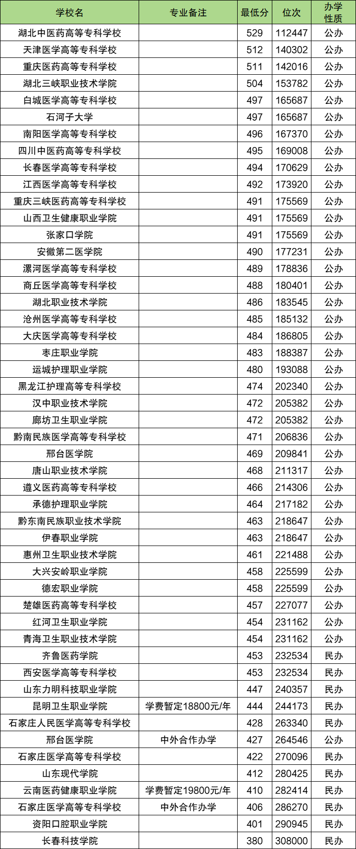 下面是专科口腔医学录取分数线一览表:
