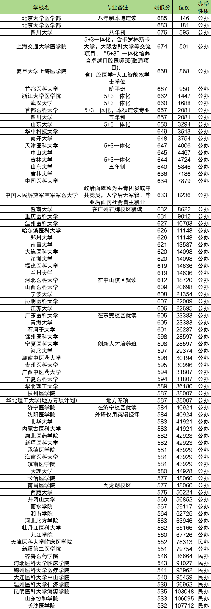 下面是本科口腔医学录取分数线一览表: