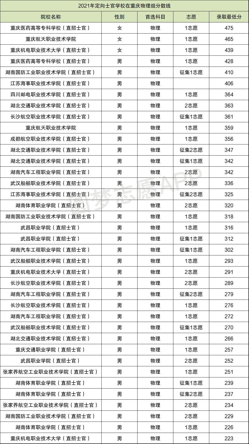 2021年在重庆物理科目组收分最高的士官学校是重庆医药高等专科学校,最低分数线为475分,这也是招收女生1志愿的分数,男生可报考的院校中收分最高的是重庆机电职业技术大学,最低分数线为439分;