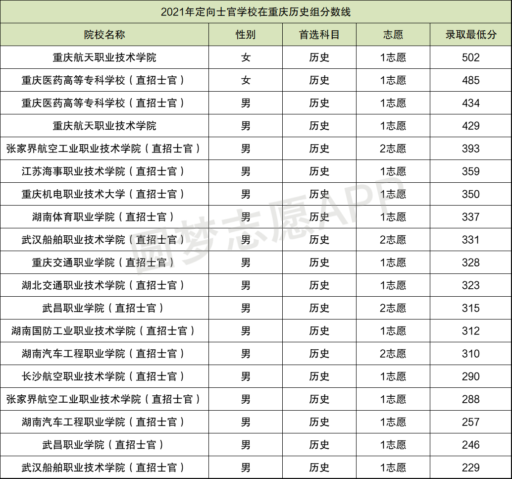 想要看自己能不能顺利考进定向士官院校肯定首先看的是往年的分数线,而每所院校在每个省份的招生计划都不一样,所以形成的分数线自然也会不同,小编就以重庆为例,根据重庆教育考试院公布的2021年专科提前批分数线,为大家整理出2021年定向士官学校在重庆的分数线,供2022年考生参考。