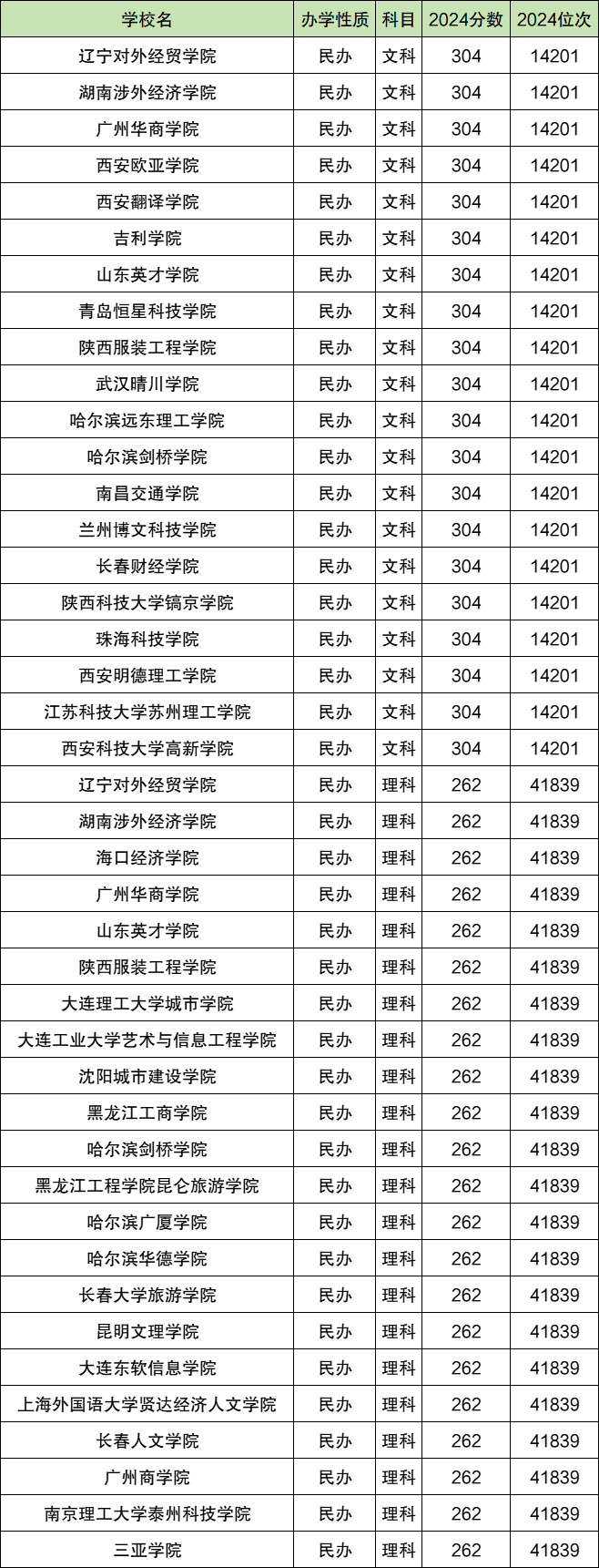 文科分数线低的民办本科对应位次为14201名,理科分数线低的民办本科对应位次为41839名。