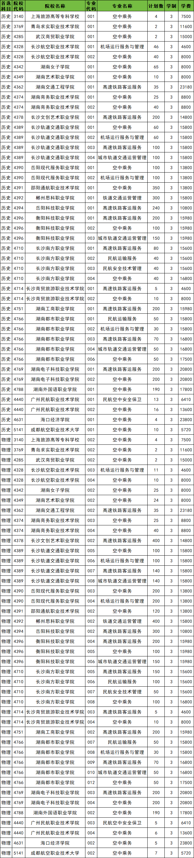 专业名单:空中乘务、高速铁路客运服务、民航运输服务、机场运行服务与管理等。