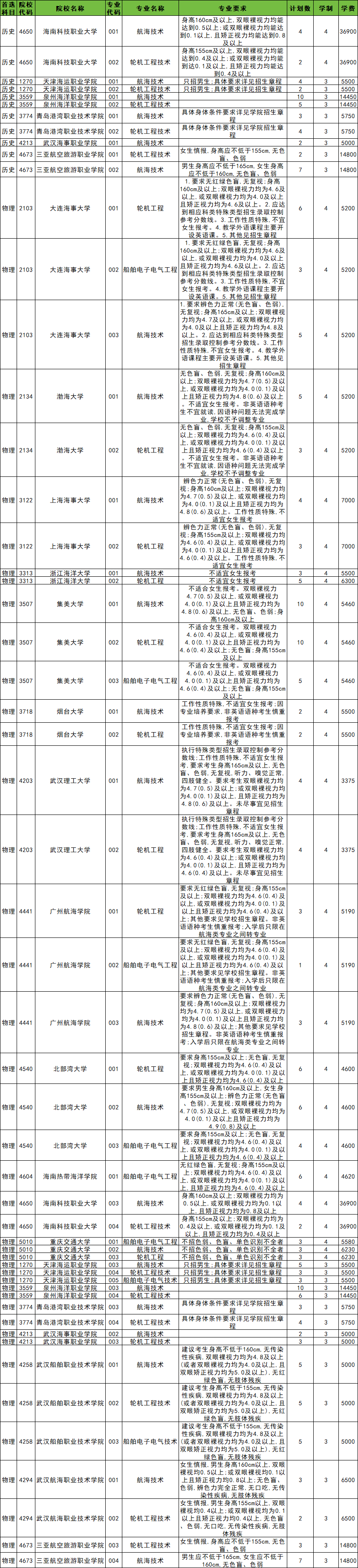 专业名单:航海技术、轮机工程技术、轮机工程、船舶电子电气工程、船舶电子电气技术。