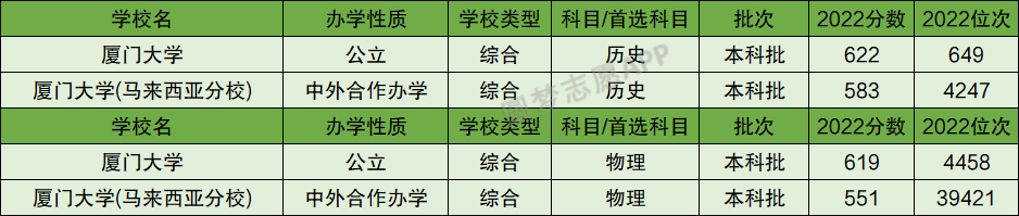 根据上图可知,厦门大学2022年在河北省历史类的投档分数线为622分,物理类的投档分数线为619分;厦门大学(马来西亚分校)在河北历史类的投档分数线为583分,物理类的投档分数线为551分。