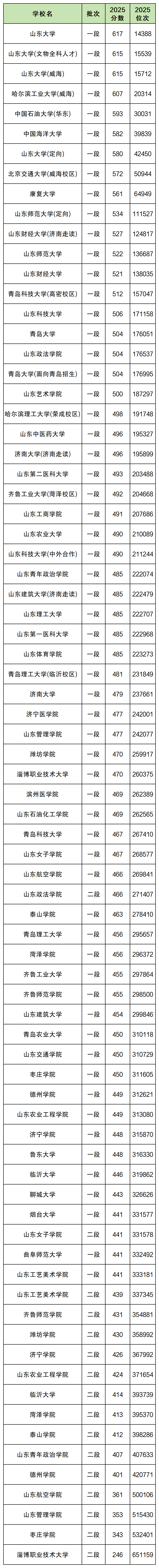 另外分数线排名最高的五所学校分别为:山东大学(617分)、山东大学(文物全科人才)(615分)、山东大学(威海)(615分)、哈尔滨工业大学(威海)(607分)、中国石油大学(华东)(593分)。
