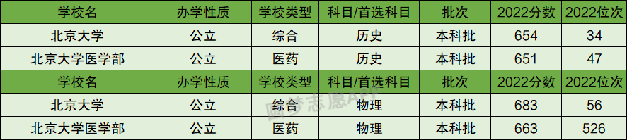 根据上图可知,北京大学2022年在辽宁省历史类的投档分数线为654分,物理类的投档分数线为683分;北京大学医学部在辽宁历史类的投档分数线为651分,物理类的投档分数线为663分。