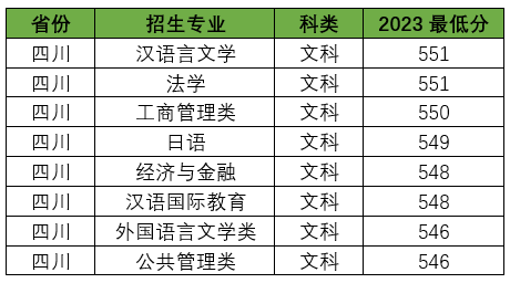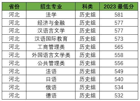 历史组录取分数最高的专业是法学,2023年最低录取分为581分;录取分数最低的专业的德语,2023年最低录取分为532分。从整体上看,和其他专业相比,小语种类的录取分数都低一些,分数基本都在550分以下。