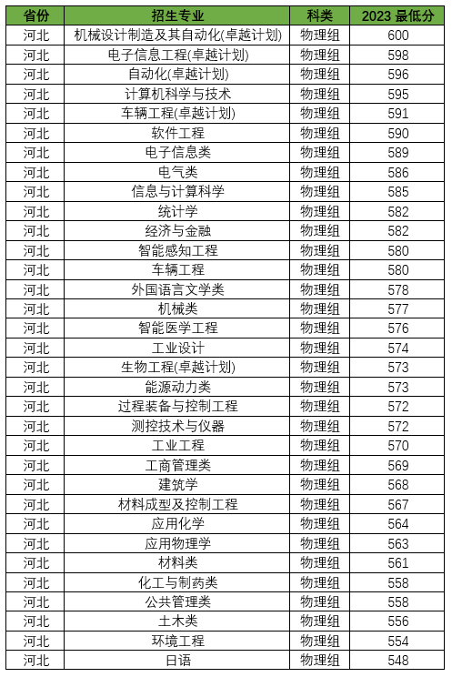 燕山大学2023年在河北省内物理组的录取分数和上文的四川理科的录取情况类似,录取分数最高的专业同样是学校的王牌专业机械设计制造及其自动化(卓越计划),2023年最低录取分同样也是600分;录取分数最低的专业是日语,2023年最低录取分548分,但要比四川录取分数最低的专业高一些。