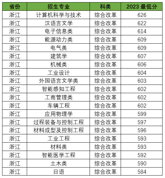 燕山大学各招生专业2023年在浙江的录取分数就比前面的两个省份更高了,大部分专业的录取分数都在600分以上,录取分数最高的专业计算机科学与技术,2023年最低录取分也达到626分。另外,录取分超过610分的专业还有汉语言文学(622分)、电子信息类(614分)。录取分数最低的专业是日语,2023年最低录取分为584分。