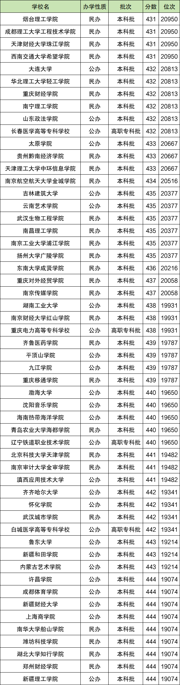 2万名左右最低位次对应的院校是烟台理工学院、成都理工大学工程技术学院、天津财经大学珠江学院,最低录取位次为20950位,位次对应分数为431分。