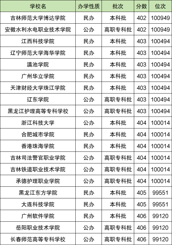 10万名左右最高位次对应的院校是吉林师范大学博达学院、安徽水利水电职业技术学院,最低录取位次为99120位以,位次对应分数为406分;